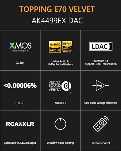 - 【Exceptional Sound Quality】- Equipped with a low-noise voltage reference power supply, the TOPPING E70 VELVET delivers ultra-clear audio with -125dB distortion and a noise level as low as 1.3uVrms, providing an unmatched listening experience.