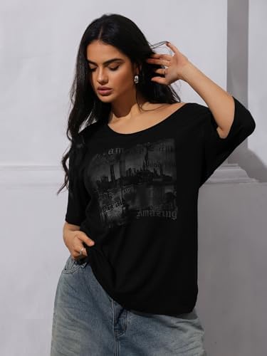 Women's Off The Shoulder Tops Graphic Goth Tee Y2k Vintage Asymmetrical Neck Oversized T Shirts