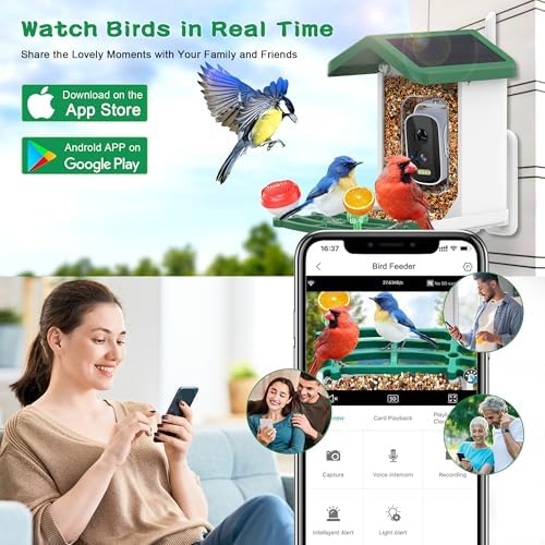 - 【4K HD BIRDWATCHING CAMERA WITH REAL-TIME ALERTS】 Upgraded to a 4K HD camera and a 150° ultra-wide-angle lens, this birdwatching camera delivers 40% sharper footage than 1080P models! Infrared and color night vision capture stunning detail, even for owls hunting at midnight. Get crystal-clear birdwatching videos and receive real-time alerts on your phone. No binoculars required, making birdwatching a breeze.