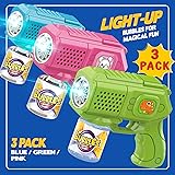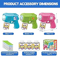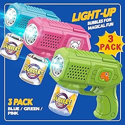 Vibrant Bubbles with Light-Up Fun: This 3-pack bubble gun ensures triple the fun, over 5000 bubbles per minute, illuminated by light-up features that add excitement to every play session Bubble Gun 3 Pack: Included are 3 bubble guns, 3 bottles of bubble solution, and 5 packets of concentrate, providing you with everything needed for endless bubble-blowing adventures Leak-Proof Design for Mess-Free Play: Designed with a leak-proof mechanism, our bubble guns allow for 360-degree rotation without any spills, ensuring a mess-free experience Durable Construction for Long-Lasting Fun: Crafted from sturdy ABS plastic and powered by a reliable motor, our bubble guns are built to withstand countless play sessions Perfect Gift for Kids: Ideal for children aged 3-12 kids. Great for weddings, parks, backyards, and indoor/outdoor play.