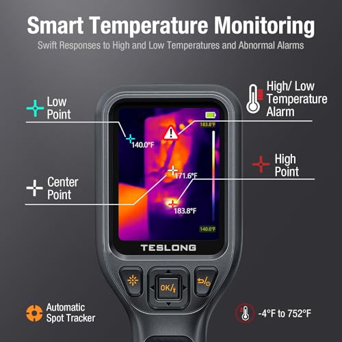 - Accurate Temperature Measurement: Infrared thermal imaging cameras utilize advanced detectors with a 50° x 38° field of view. Teslong thermal imager has a temperature range of -4°F to 752°F with a measurement accuracy of ±2°C. It automatically locks and displays the highest, lowest, and center point temperatures within the scan, along with temperature exceedance alarms, enhancing the efficiency of fast anomaly recognition
