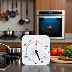 - Introducing the White Square Timer Clock, a 60-minute mechanical timer that's a must-have for any kitchen. This wind-up visual timer is perfect for cooking, baking, and managing your time in the kitchen. With its loud alarm, you'll never miss a beat, even when you're multi-tasking. The best part? No batteries are required, making it an eco-friendly and hassle-free choice. Whether you're a seasoned chef or a beginner, this timer will become your trusty companion, ensuring your culinary creations turn out perfectly every time. Its sleek and modern design will complement any kitchen decor, while its sturdy construction ensures long-lasting durability. Upgrade your kitchen game with the White Square Timer Clock today!