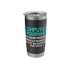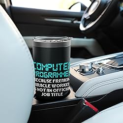 Check out this fun, COMPUTER PROGRAMMER BECAUSE FREAKIN’ MIRACLE WORKER IS NOT AN OFFICIAL JOB TITLE programming design available on a variety of interesting items that make a great computer programmer gift or gift for a programmer. Click brand name above for more computer programmer shirts, information technology gift, web designer gifts, computer teacher gift, coder gift, web designer gifts, IT guy gifts, IT girl gifts or gifts for anyone that works in computer science. Dual wall insulated: keeps beverages hot or cold Stainless Steel, BPA Free Leak proof lid with clear slider