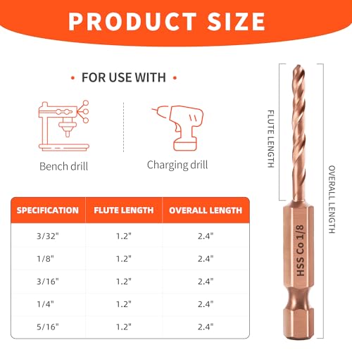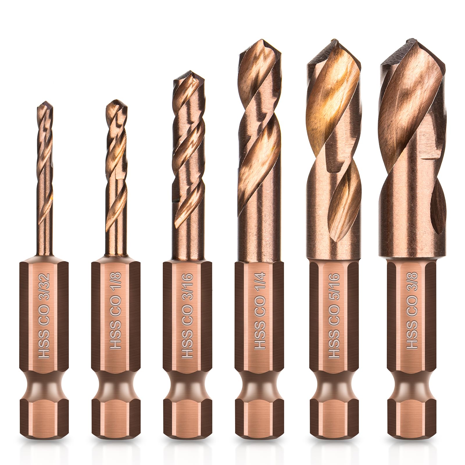 - Popular Sizes: 3/32", 1/8", 3/16", 1/4", 5/16". All metal drill bit set for steel come with one-piece 1/4-inch hex shank compatible with standard and quick-change chucks and drivers. Suitable for drilling stainless steel and various hardened metals such as cast iron, titanium, bronze, aluminum, etc.