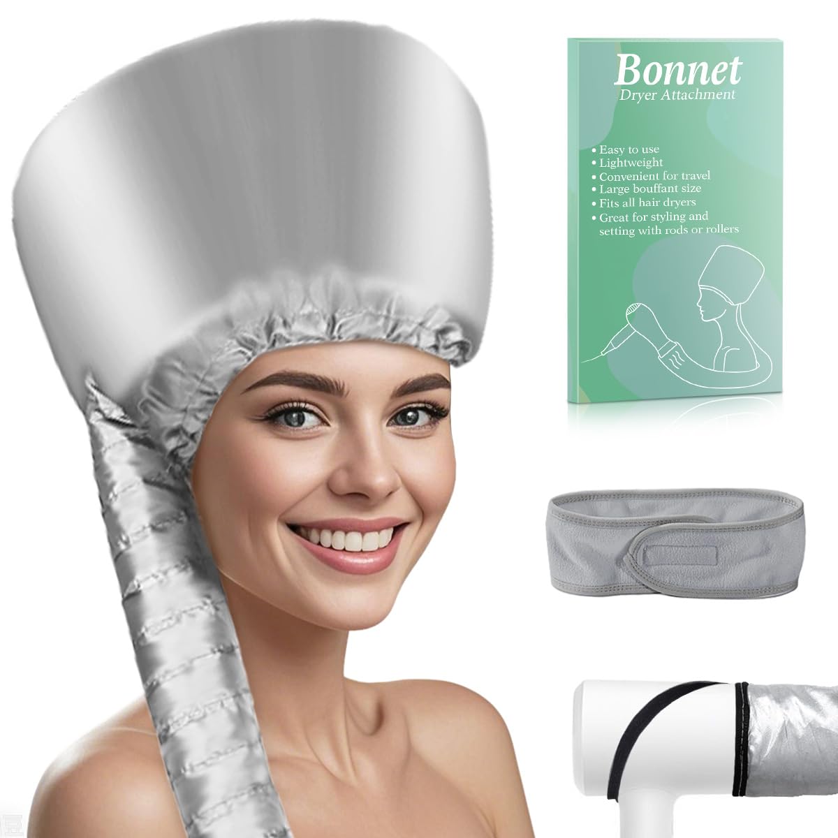 Hooded Hair Dryer Bonnet – Adjustable Attachment for Soft, Adjustable Hood for Speedy Drying, Styling, and Deep Conditioning, Travel-Friendly and Lightweight(Silver)