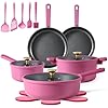 - Set Includes: 9.5" fry pan, 11" fry pan, 2.5-qt saucepan with lid, 5-qt sauté pan with lid, 5-qt stockpot with lid, 5*utensil, 4*pan protectors.