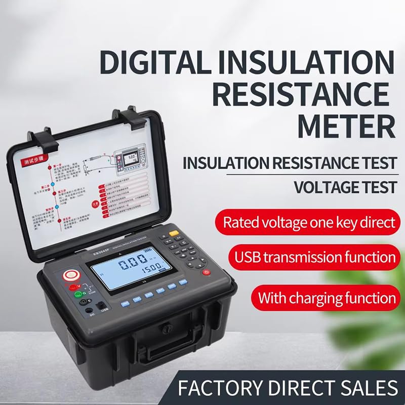 Specifications Function:Leakage protector action time measurement, leakage protector action current measurement, voltage measurement. DC voltage range:1.0~1000V DC voltage resolution:0.1V AC voltage range:1.0~750V AC voltage resolution:0.1V Leakage current gear:15 , 30 , 50, 75, 100, 150, 200, 250, 300, 500 mA Leakage action time:0~999 mS Test mode:Manual (nt) or automatic (At) Power supply:8 1.5V (AA) alkaline batteries Back light:Controllable gray and white screen backlight, suitable for use in dark places Auto off:Instrument shut down after 15 minutes without operation Display mode:4-digit super large LCD display, gray and white screen backlight LCD display size:73mm×43mm Meter size:175mm (length)×112mm (width)×53mm (high) Test line:Test line red 1 meter, black 1 meter Data storage:500 groups, flashing “FULL” symbol means storage is full Data review:Data query function: “MEM” symbol display Quality:1230g(battery included) Operating Temperature and Humidity:-10℃~+50℃<85%RH Storage Temperature and Humidity:-15℃~+55℃<90%RH Suitable for safety regulations:IEC61010-1 CAT Ⅲ 600V,IEC61010-031,IEC61326,Pollution Degree 2