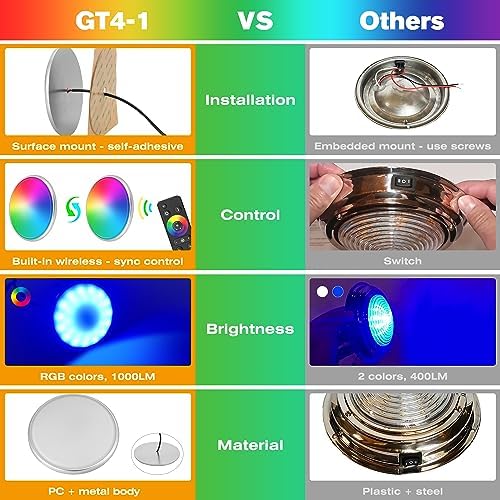 - TOP MARINE MATERIALS: RGB 5050LEDs√ 1000LM DC12V 10W Super Bright Boat Interior Lights√ Patented Chip√ 4.5inch√ IP65 Fully Filled Glue (Above Water Use ONLY) √ Anti-corrosion Metal Body√ Tinned Copper Wire√ Personalized Wiring Port