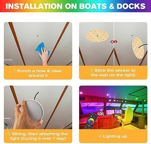 - SUPER EASY INSTALLATION: There are only two lines (positive & negative ) for each boat ceiling Light, they don't need any hub. Install directly with 3M stickers, easy & quick. Power on each group of lights and pair them with the remote control respectively. Then just install it like a monochromatic light, you can control all the lights in groups, it's really easy and charming