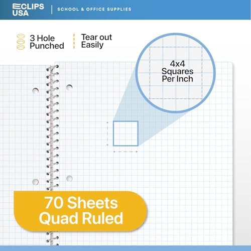 E-CLIPS USA Graph Paper Notebook, Spiral Graph Paper Notebook, Grid Notebook, Quad Ruled Notebook, 8 x 10.5, 4 x 4 Square Per Inch, (6 Pack)