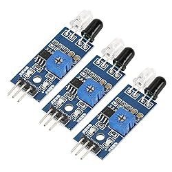 When module detects obstacles ahead, the green indicator light on the circuit board is on and at the same time the OUT port outputs low level ; detection distance can be adjusted with potentiometer, clockwise to increase detection distance;c It can be widely used for robot obstacle avoidance, obstacle avoidance car, assembly line, black and white line tracking and many other occasions. Active infrared reflection detecting sensor, so the target reflectivity and shape is the key of the detection range.Black color has the minimum detection range, white has the maximum; small objects have short detection range, large objects have long dete The detection range of the sensor can be adjusted with potentiometer, little interference, easy assembly and use. Sensor module output port OUT can be directly connected to micro-controller IO port, also can drive a 5V relay directly.
