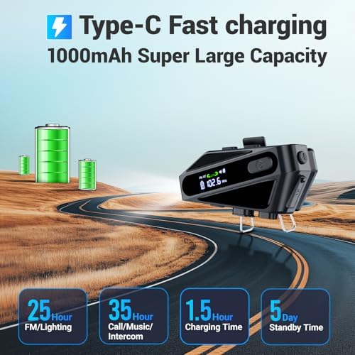 - 1000 mAh Longer Battery Life: Bluetooth motorcycle helmet With an 1000mAh lithium-ion battery and Type-C fast charging, 25-35 hours of music Share/call/intercom and music, 120 hours of standby, and the helmet headset takes only 1.5 hours to fully charge, ensuring that you'll have continuous use throughout the day.