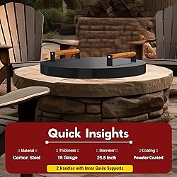 Perfect Compatibility: This outdoor fire pit cover is expertly designed to fit fire pits with an inside diameter of up to 23", offering a secure and reliable fit for improved safety and ease of use. Built to Last: Constructed from robust carbon steel and finished with a protective powder coating, this fire pit lid is engineered to endure tough outdoor conditions, guaranteeing long-lasting durability and performance. Powder-Coated Protection: Equipped with a durable powder-coated finish, this fire pit lid offers enhanced resistance to rust, scratches, and other damage, ensuring it remains in top condition for years. Dual Ergonomic Wooden Handles: Featuring two ergonomic wooden handles, this fire pit lid ensures easy handling and transportation, providing a safe and comfortable experience during use. Versatile Tabletop Use: When not in use for the fire pit, this lid doubles as a convenient tabletop surface, offering added functionality and making it perfect for outdoor entertaining.
