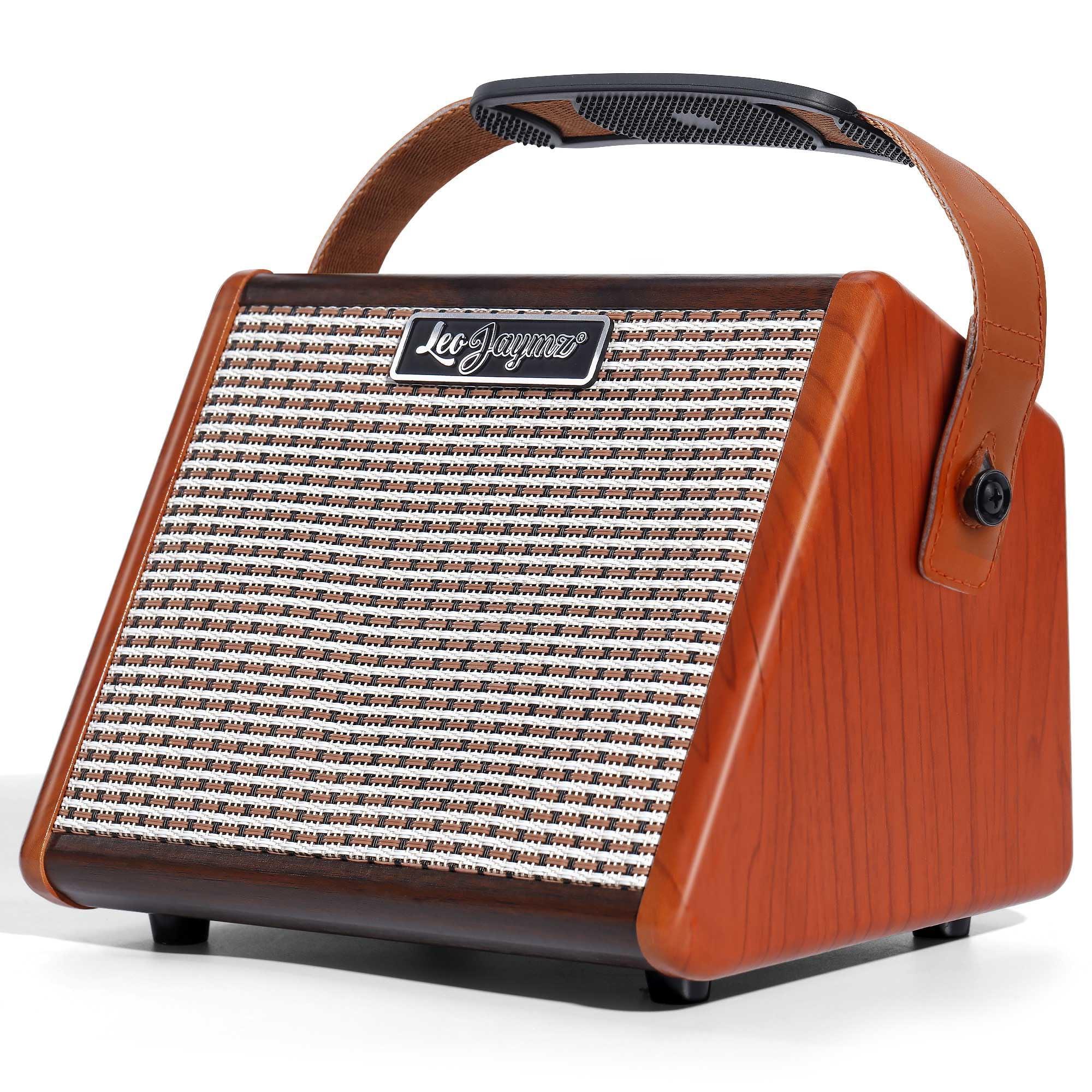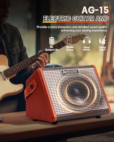 Leo Jaymz 15W Portable Electric Guitar Amp with BT, Rechargeable Battery, Built-in Effects Reverb, Overdrive, EQ, Woodgrain Finish, and 6.35mm Headphone Jack (AG-15)