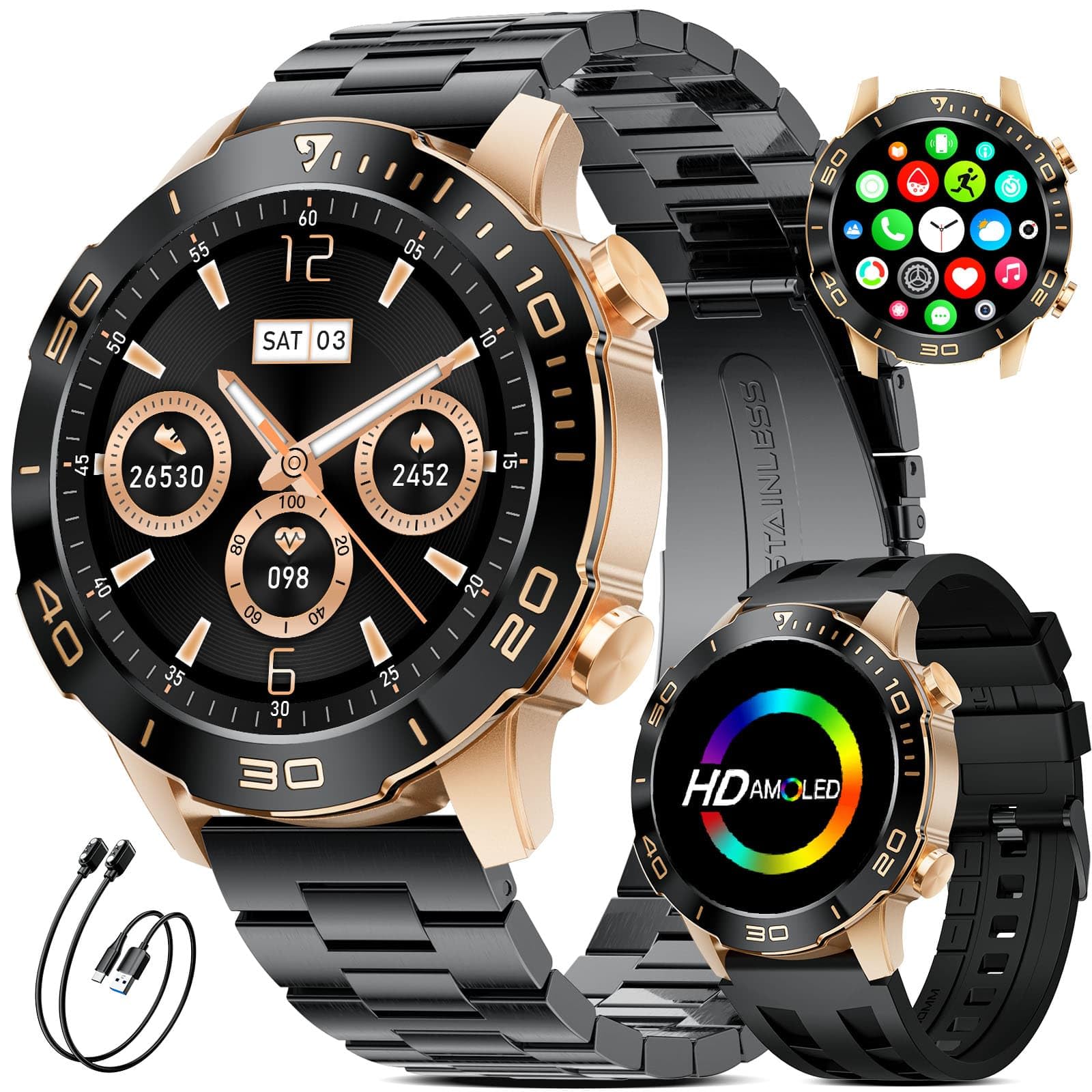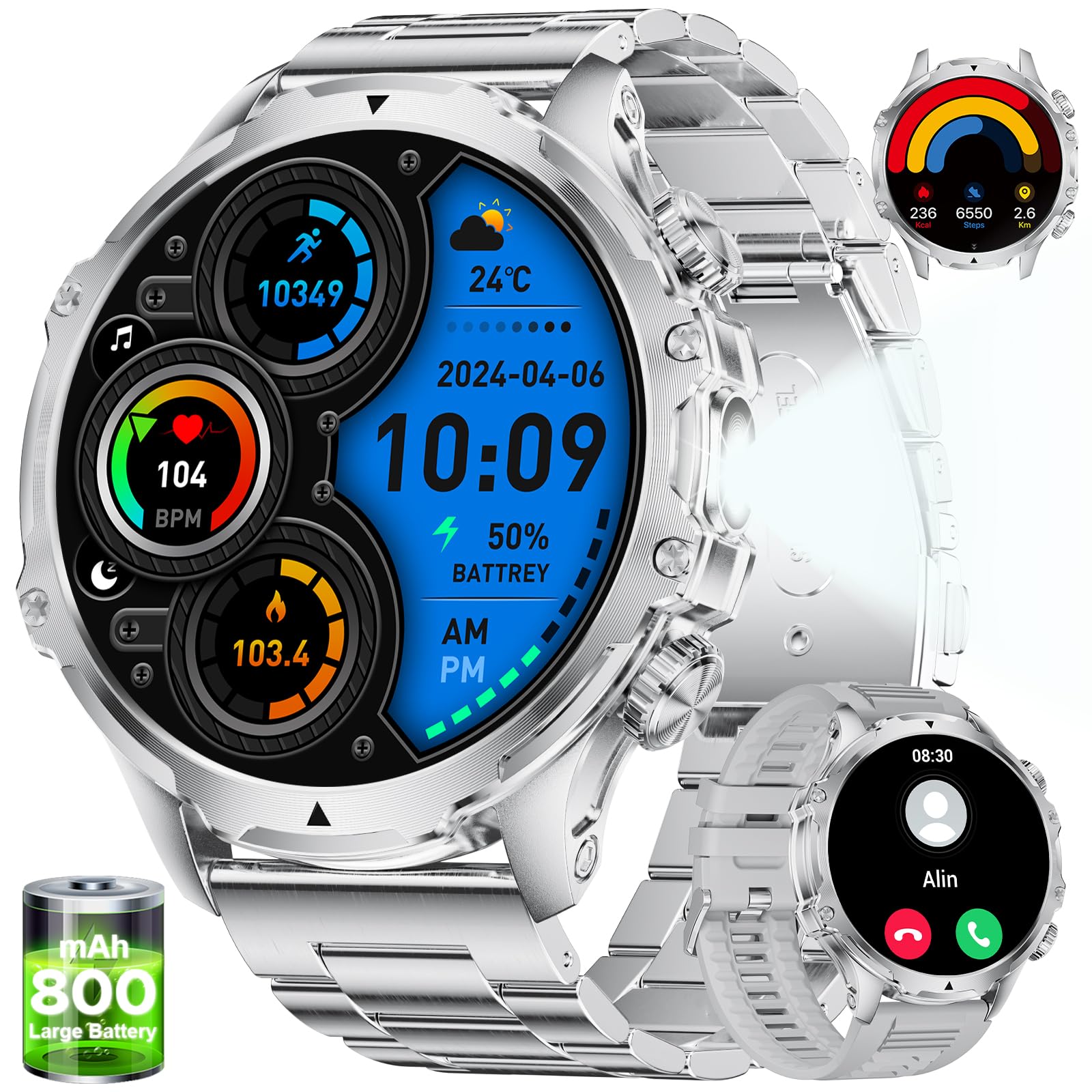 - 🔋【100+ Sports Modes】This men's smartwatch offers over 100 sports modes, covering almost all daily physical activities. It tracks total exercise time, calorie burn, exercise heart rate, steps, and distance, giving you a comprehensive understanding of your workout performance. The all-day activity tracking feature monitors your steps, distance, and calorie burn, helping you track your progress toward your fitness goals.