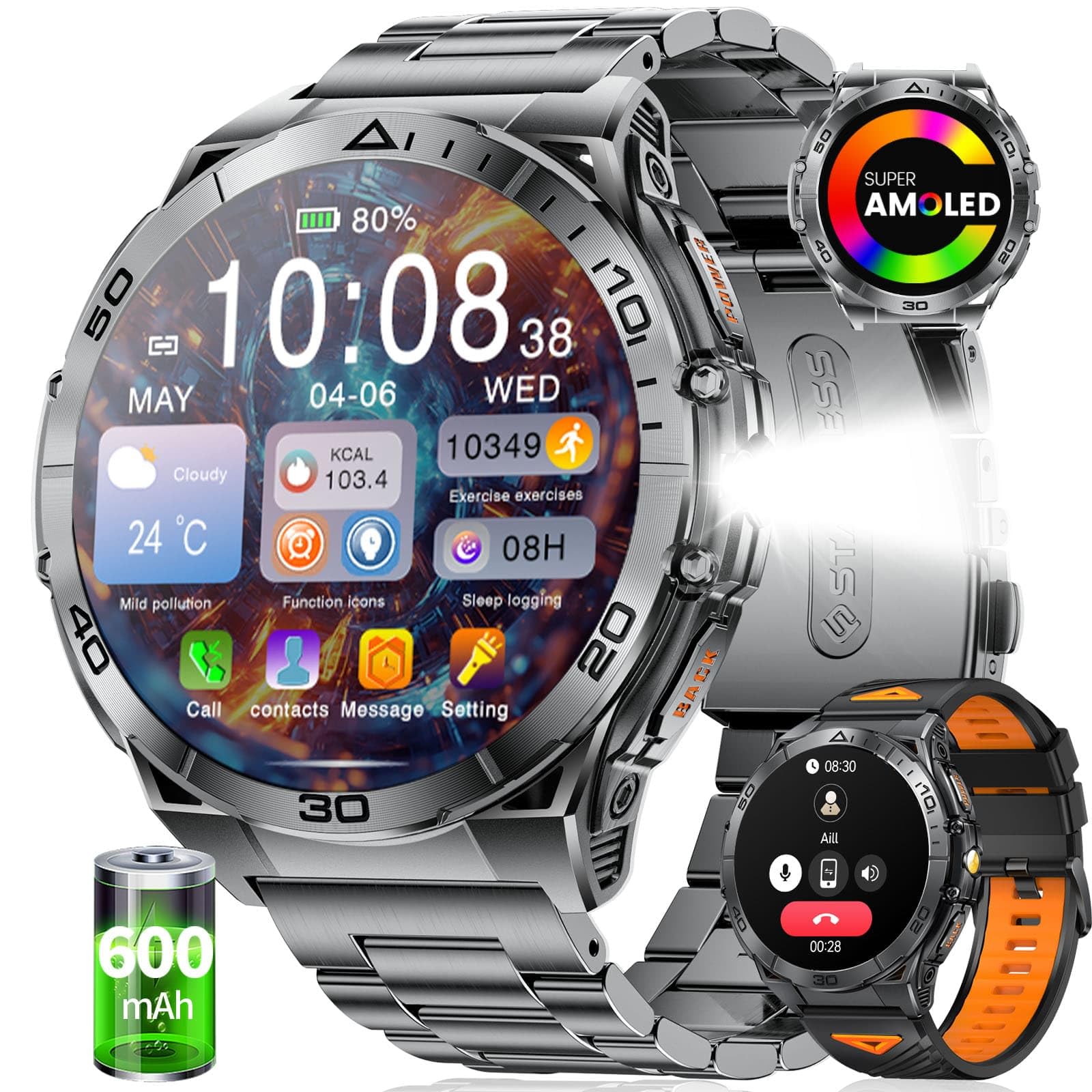 - 🔋【LED Flashlight】The Android smart watch for men comes equipped with a powerful flashlight with an illumination range of 6-8 meters. Perfect for camping, hiking, and nighttime adventures. The focused beam lights your path in the wilderness, ensuring safer night outings! It provides instant illumination during power outages, nighttime car breakdowns, or any emergency requiring immediate light. In critical moments, users can activate the light to send out a distress signal.