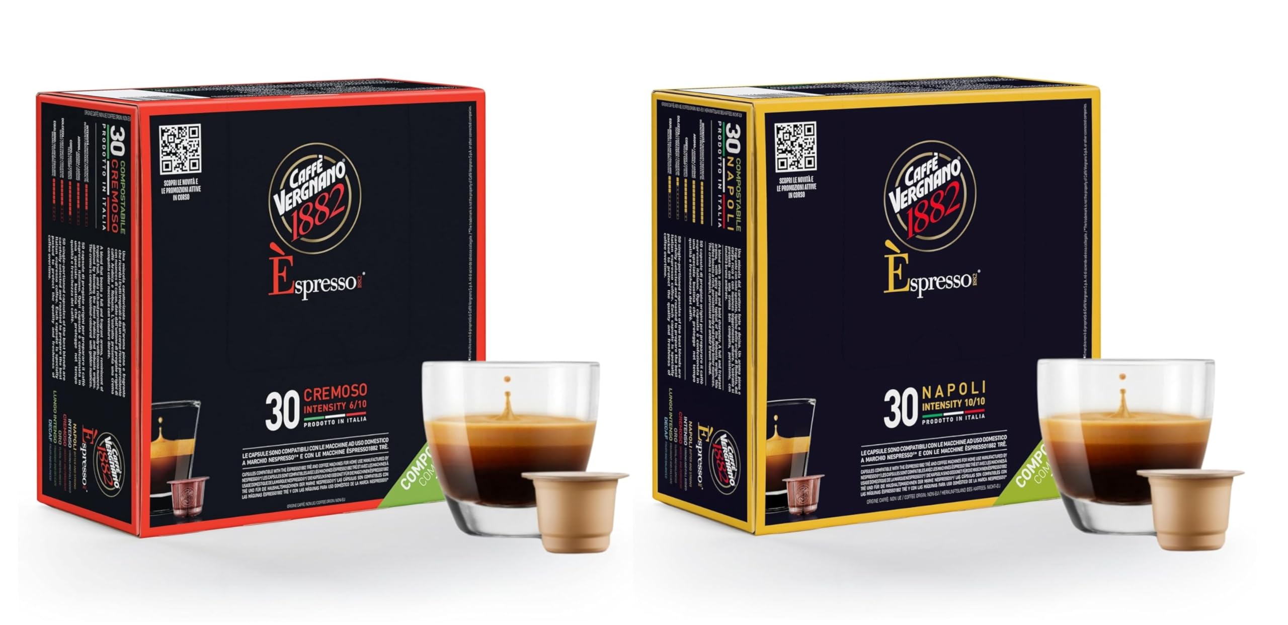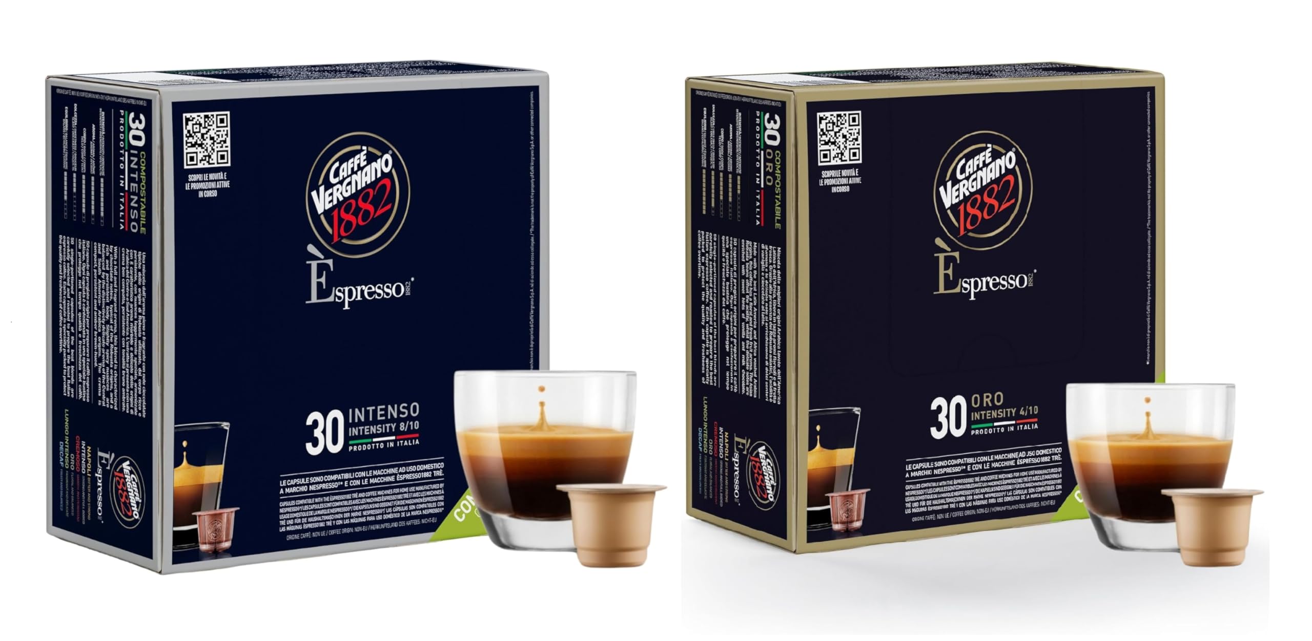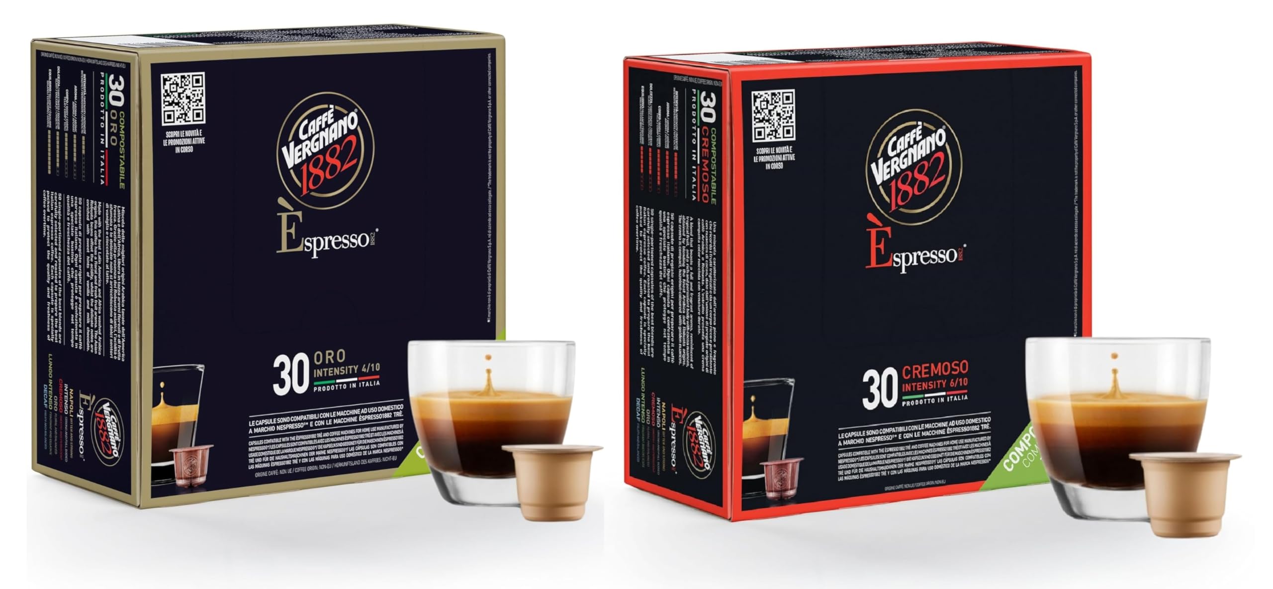 Savor Smooth and Balanced Italian Espresso The Caffe Vergnano Medium Roast Espresso Bundle includes: Oro Capsules (50 Ct): A delicate and balanced blend with an intensity of 4/10, offering a smooth and mellow espresso experience. Cremoso Capsules (50 Ct): A creamy and well-rounded blend with an intensity of 6/10, perfect for a balanced yet flavorful coffee. Designed for Nespresso Original Line coffee machines, this bundle provides two harmonious flavors, ideal for those who appreciate both light and medium espresso profiles. Made from premium Arabica and Robusta beans, these single-serve pods deliver a consistently fresh and authentic Italian coffee experience. Perfect for any time of the day!