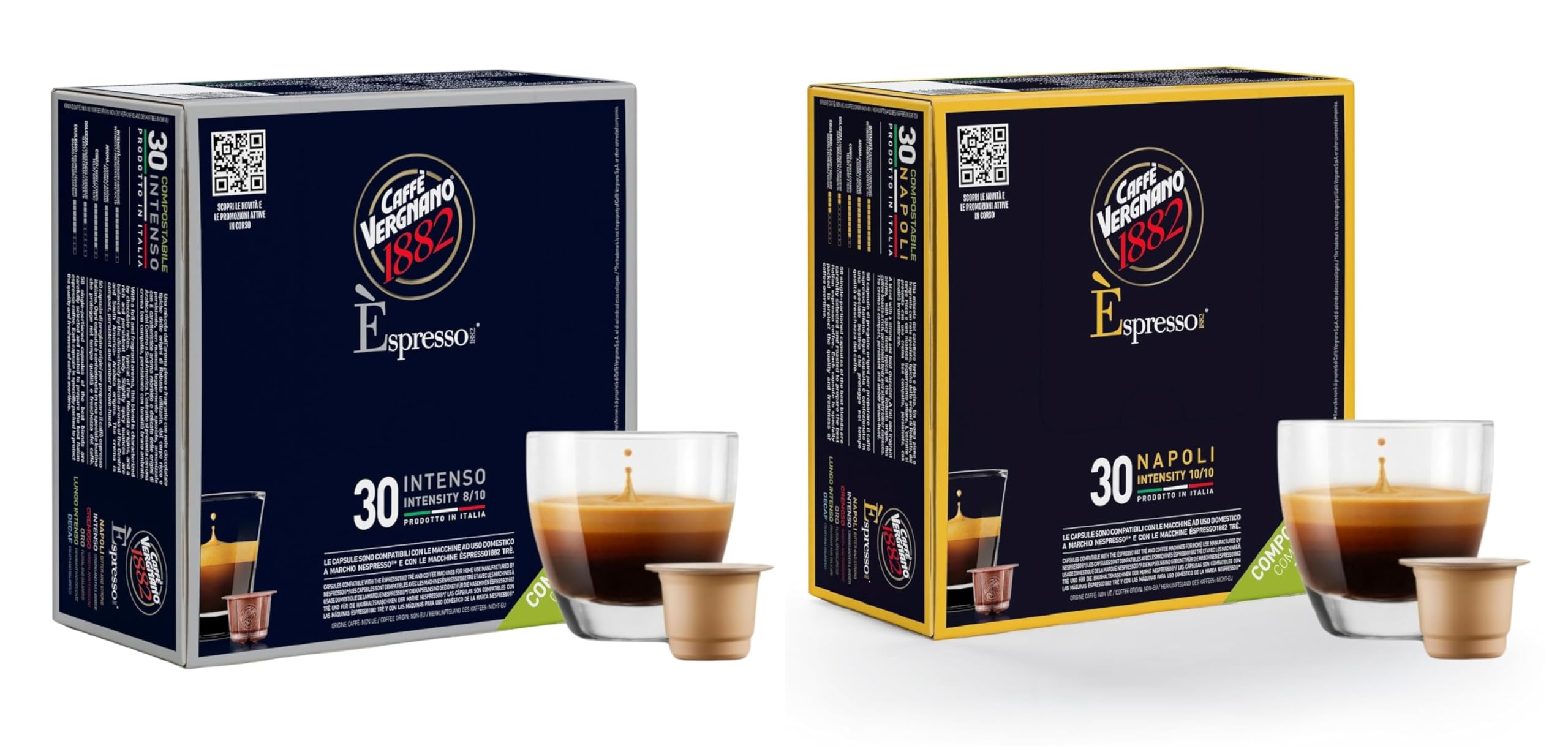 - Strong & Full-Bodied Italian Espresso – Caffè Vergnano Èspresso1882 delivers a bold, full-bodied espresso experience with an intensity of 4/10 and Intenso with an intensity of 6/10. Perfectly crafted from a blend of Arabica and Robusta coffee beans, these espresso pods bring the rich and robust flavors of Italian coffee to your espresso cups.