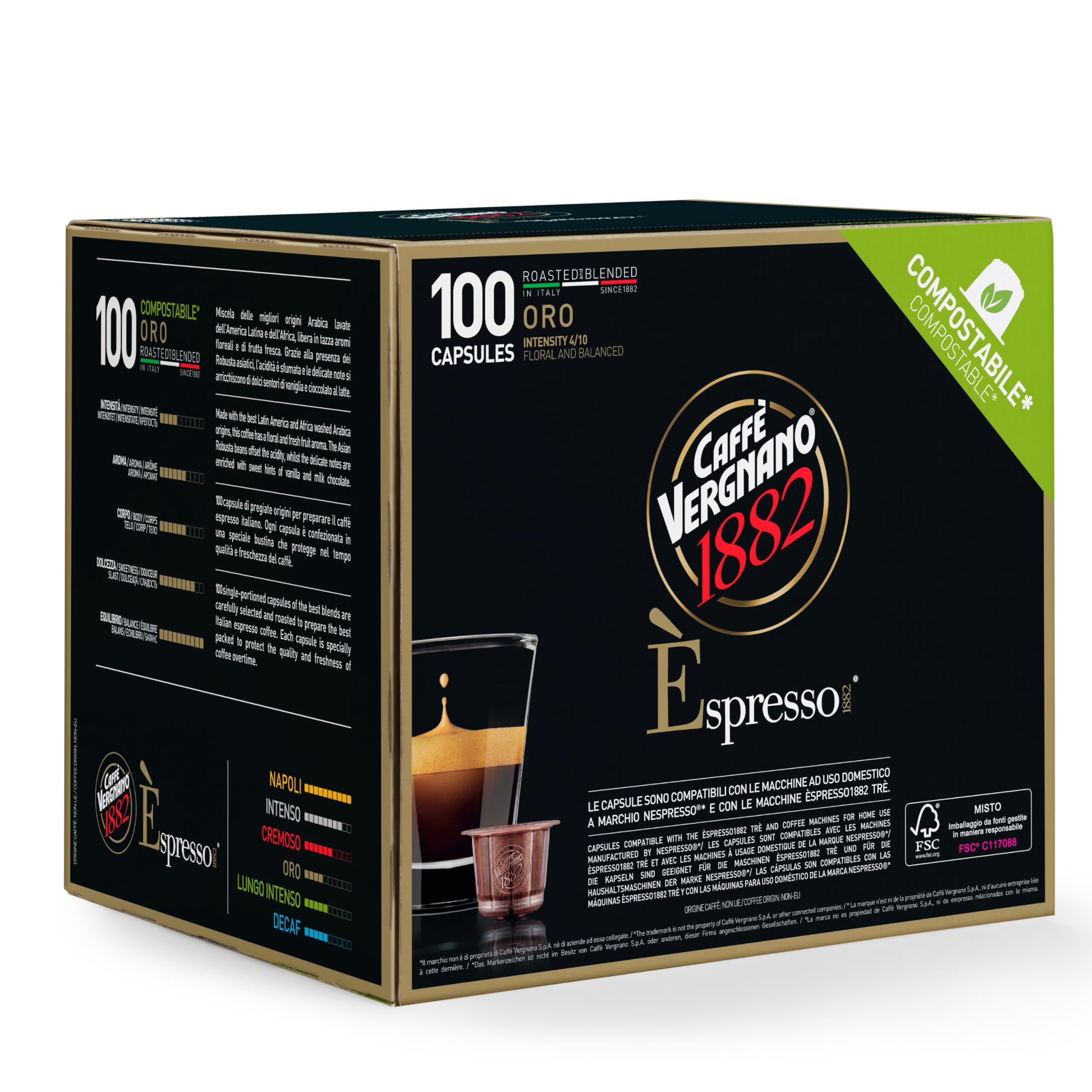 Caffe Vergnano Medium Roast Espresso Bundle - Oro (4/10) & Cremoso (6/10) Capsules, Single-Serve Italian Coffee Pods Compatible with Nespresso Machines, 100 Ct