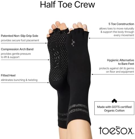 ToeSox Women's Cotton Crew Toe Socks with Grip are designed to elevate your studio sessions with a secure, breathable, and balanced barefoot alternative. Featuring a half-toe design that separates each toe, these five finger socks for women allow for natural movement and improved stability during yoga, Pilates, barre, and other low-impact workouts. The patented non-slip grip sole keeps your feet grounded on smooth studio floors, helping reduce the risk of slipping without restricting motion. These long toe socks are made from a soft and stretchy blend of 80% organic cotton, 16% polyester, and 4% elastane, offering comfort, durability, and a snug fit that moves with you. The crew length adds extra coverage and warmth, making them ideal for cooler studios or post-practice lounging. Whether you're a beginner or a seasoned pro, these cotton toe socks for women support hygiene, alignment, and comfort with every step. Easy to care for and available in a variety of colors and sizes, they’re a practical and stylish choice for anyone looking to enhance their barefoot training experience. Wash inside out in a gentle cycle and line dry or tumble dry on low for long-lasting performance.