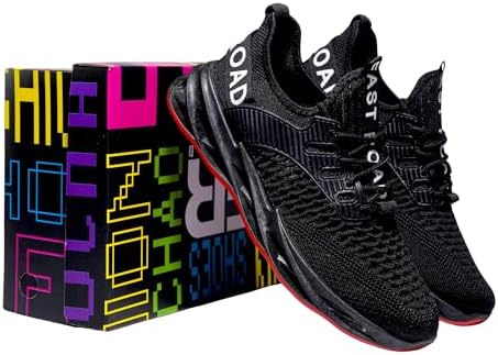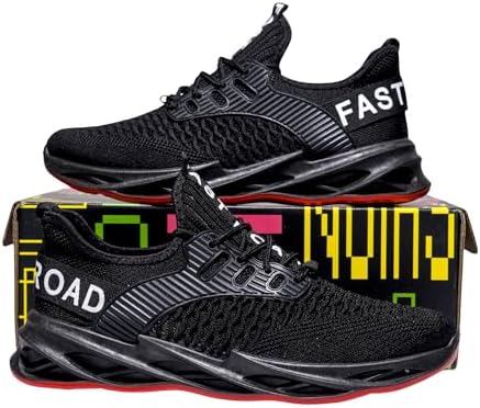 Fast Road Ablaze Runners - Black & Red Athletic Sneakers, Breathable Mesh, PVC Anti-Slip Soles, Cushioned Comfort, Secure Fit for Runners & Gym Enthusiasts US 6.5-12