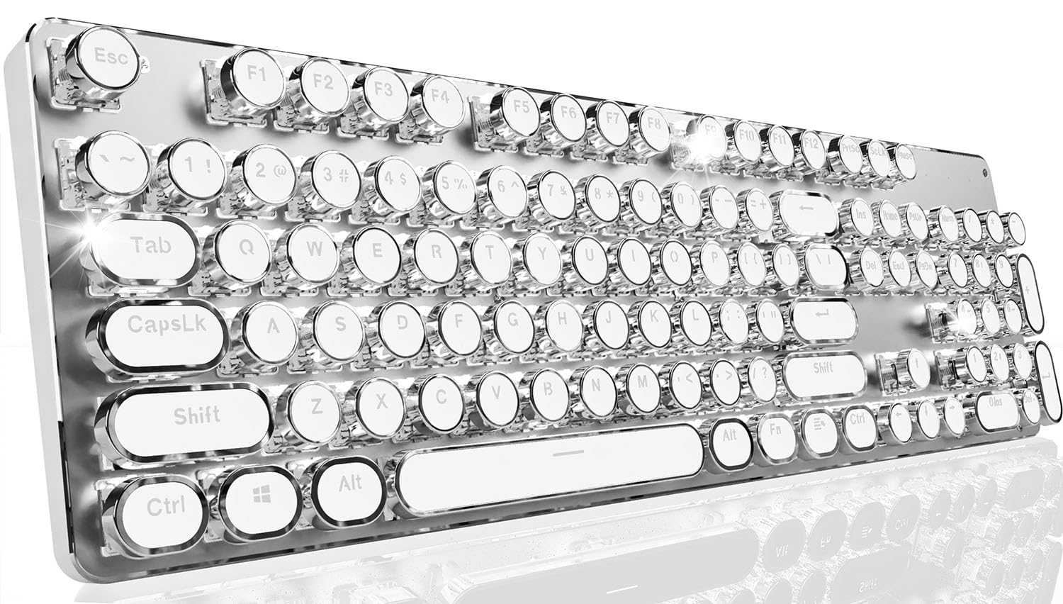 - Retro Typewriter Style Round Keycaps: The TK950 wireless typewriter keyboard uses a double-shot injection retro punk round keycap with a clear backlight, which is extremely durable. Stepped floating keycaps that fit your fingertips perfectly, a precise position. Ergonomic foot support makes typing less tiring and more comfortable. The highly durable mechanical blue switch responds faster and more quickly, accompanied by a crisp click