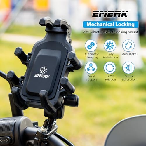 EMERK Motorcycle Phone Mount Holder - [Dual Vibration Dampener] [Anti-Shake Anti-Theft] Bike Phone Holder, Adjustable Handlebar Cellphone Cradle for Bicycle Road Scooter ATV Fit 4.7''-7.2'' Smartphone