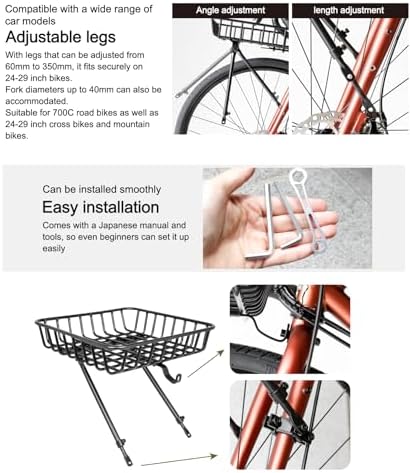 [Adjustable basket] With legs that can be adjusted from 60mm to 350mm, it fits securely on 24-29 inch bicycles. You can freely set the height to suit your bicycle. [Made of sturdy and reliable steel] The main body is made of durable steel. In addition, the aluminum alloy finger hook part firmly supports luggage up to 10kg. Strength and rust resistance that are reliable for everyday use. [Large capacity spacious space] With a large design of 330 x 330 mm, it can store various luggage such as shopping bags, commuting bags, leisure goods, etc. Ideal for commuting, going to school, shopping, etc. [With cargo collapse prevention net] Comes with a 400mm x 400mm, elastic net with a stretch rate of about 200% and 6 hooks. Luggage will not fly out even while driving, supporting safe driving. [Easy to install for anyone] Not only can it be fixed using dowel holes, but even if there are no dowel holes on the front fork, it can be used with the included fittings. Comes with a Japanese instruction manual and tools, so even beginners can install it without hesitation. [Compatible with a wide range of models] Compatible with 700C road bikes to 24-29 inch cross bikes and mountain bikes. Fork diameters up to 40mm are also supported. [Product Contents] Front basket (with net, adjustable) [Accessories] Net, installation tools, installation instructions in Japanese [Suitable size] 700c 24-29 inch bicycles [Maximum load] 10kg [Size] Basket: 330 x 330mm (height 70mm, diameter φ8mm, weight 867g, steel (anti-rust painted) Included net: 400 x 400mm (stretch rate approx. 200%, with 6 hooks, weight 165g) / Telescopic leg: Telescopic 260-350mm (diameter φ9-14mm, weight 100g x 2, steel (anti-rust painted)) / Fork center bracket: width 16 x total length 153mm (weight 56g) [Installation method] Center dowel hole of fork crown and front fork *Please be sure to check before purchasing. This product can be installed on bicycles that have a dowel hole in the center of the front fork crown. Please check in advance whether your bike has these mounting holes before purchasing. Also, please make sure that the fork diameter is within a maximum of 40mm. If your front fork does not have a dowel hole, there are some models that can be mounted using the included hardware, but it may not fit some bikes with special shapes.