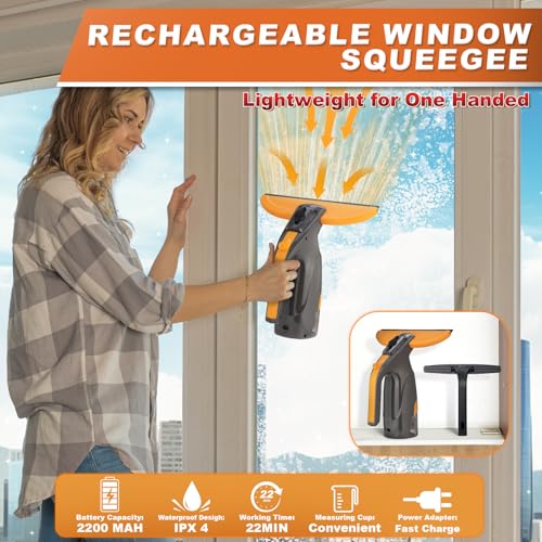 - 3-in-1 Electric Window Cleaner: The window vacuum comes with 2 x Microfiber Cleaning Cloth, 1 x Spray Bottle (built-in), 1 x Storage Tank (built-in), 1 x Charging Adapter, 1 x Cleaning Wiper, 1x Measuring Cup, 1 x Maunal. One-touch to spray, cleaning and absorbs water with this window cleaning tool, makes clean more Convenient and efficient