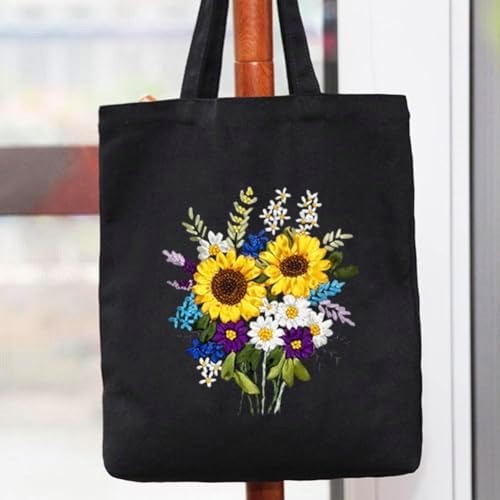 Canvas Tote Bag Silk Ribbon Embroidery Kit for Beginners, Arts and DIY Crafts Kits with Pattern for Adults, Include Stamped Flower Pattern, Hoop, Color Silk Ribbons and Tool (Black Bag, Sunflower)