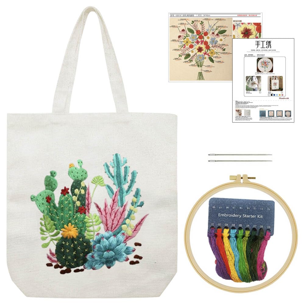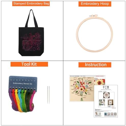 - Handmade Embroidery Kit Set -- This embroidery kit includes a canvas tote bag with beautiful flower pattern, 1 x adjustable bamboo embroidery hoop, 1 x English embroidery instructions, 1 x Color Silk ribbon and 2pcs embroidery needle.