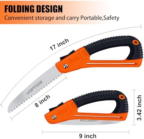 - 【Compact and Portable Folding Design】With a fully extended length of 17 inches and a folded length of just 9 inches, this saw is designed for convenient storage and portability. Ideal for outdoor enthusiasts, it fits easily into your backpack for camping, hiking, or survival gear needs.