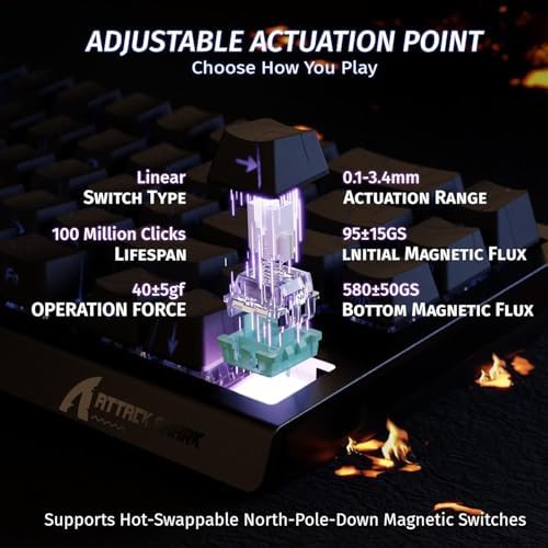 - 【Customizable Actuation Points】Equipped with exclusive self-designed magnetic switches, the keyboard supports various N-pole down switches for unparalleled versatility. Achieve precise keystrokes with 0.01mm accuracy, 0 dead zones, and customizable trigger points ranging from 0.1mm to 3.4mm for perfect tactile feedback in competitive gaming.Easily mix and match switches for a fully personalized tactile feel, enhancing your gaming or typing performance with custom configurations.