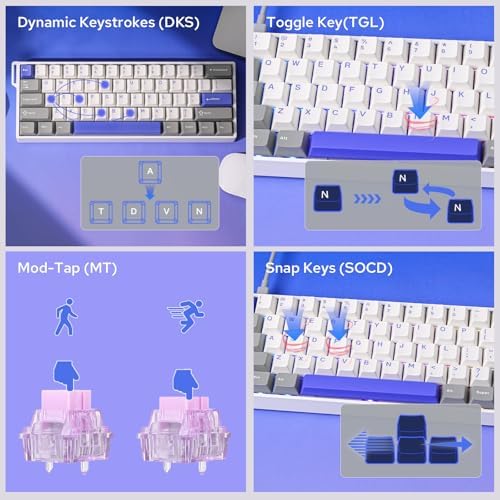 - Snap Tap & Dynamic Keystroke: Snap Tap ensures lightning-fast directional changes in FPS games by prioritizing the latest input between two keys. Dynamic Keystroke introduces true analog input, enabling up to 4 actions in a single stroke for seamless combos and macros.