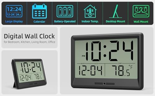 Digital Wall Clock Battery Operated, 8 Inch Small Wall Clock with Large Display, Temperature and Date | Simple Desk Clock | Silent Wall Mount Digital Clock for Bedroom, Kitchen, Living Room, Office