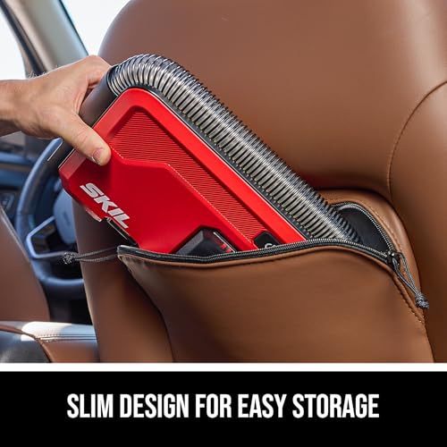 Clean up crumbs, dirt, and debris from floor mats and hard-to-reach spots in your car and around your home with the SKIL 12V/20V Brushless Slim Vacuum.This compact cordless vacuum features a slim, two-inch thick depth for easy storage in seatback pockets and includes a hanging clip for easy access when you’re on the go. The cordless car vacuum delivers powerful suction with up to 60 inches of water lift (sealed suction) to pick up tough debris. Empty the vacuum when it’s full with simple one-click disposal. Onboard storage conveniently stows the included crevice and brush nozzles as well as inflator attachments for easy access. Its flexible hose reaches up to 3.5 feet to access corners and crevices, and multilayer filtering traps allergens and particles as small as 0.3 microns. The included 20V 2.0Ah USB-C battery features two-way rapid charging that allows you to charge the battery or portable devices with its 60W USB-C port. When it’s time to recharge the battery, the multifunctional charger ditches the traditional power tool charging dock for a compact, convenient format that can plug in anywhere. The kit includes the compact vacuum, 20V 2.0Ah USB-C battery, 20W USB-C charger, charging cable, crevice nozzle, brush nozzle, (2) clips, and (2) inflator attachments.
