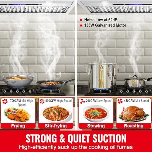 • Whisper-Quiet Performance: Crafted from high-quality stainless steel, our range hood combines durability and strength with a sleek, rust- and corrosion-resistant design. Powered by a galvanized motor, it offers impressive suction of up to 900 CFM while maintaining a low noise level of just 62dB. This ensures an effective and quiet air purification process, keeping your kitchen environment peaceful.