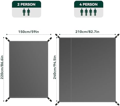 - ULTRA-LIGHT AND PORTABLE: Our tent mats are available in a variety of sizes, 86" x 59" and 94" x 82", which can be perfectly matched with 2-person and 4-person tents, 2-person mats are packed with 11" x 5.5" x 2.4" and weigh only 0.69 lbs, 4-person mats are packed with 11.4" x 6.3" x 2.7" and weigh only 1.0 lbs, which can be very easy to carry