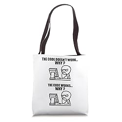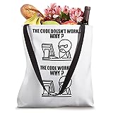 Grab this funny Programmer Code Doesnt Work Art for your programmer nerd dad, mom, husband, brother, friend or relative! It's the perfect geek gift idea & present for birthday, father's day And mother's day! 16” x 16” bag with two 14” long and 1” wide black cotton webbing strap handles. Made of a lightweight, spun polyester canvas-like fabric. All seams and stress points are double-stitched for durability, and the reinforced bottom flattens to fit more items and hold larger objects. Spot clean/dry clean only.