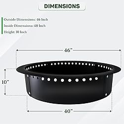 Durable Carbon Steel Build: Crafted from high-quality carbon steel, this smokeless firepit ring is designed to withstand intense heat and outdoor conditions for long-lasting use. Spacious and Efficient: Featuring a 46” outer diameter, our outdoor fire pit ring is designed with advanced airflow technology to minimize smoke for a more enjoyable bonfire experience. High-Temperature Resistant Finish: Designed with a heat-resistant coating, this surface endures extreme temperatures while preventing rust and corrosion for long-lasting durability. Easy DIY Installation: Perfect for outdoor smokeless fire pits, its straightforward design seamlessly integrates into both in-ground and above-ground setups, making it ideal for homeowners and outdoor lovers. Lightweight and Portable Design: This wood-burning fire pit ring is compact and easy to carry, making setup quick and hassle-free for camping, backyard gatherings, or patio use.
