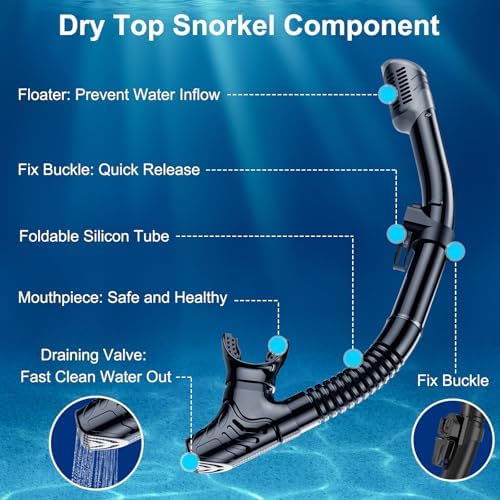 - High-Performance Dry Snorkel:Snorkel Set Adults Features a food-grade silicone mouthpiece for comfortable and safe breathing.The dry-top valve automatically seals when submerged, preventing water entry.