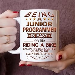 【Energy-Boosting Gifts】: When the shift begins, it can be difficult for Junior Programmer find time to prepare something energizing, such as a cup of tea or coffee that is kept warm or cold at all times. This tumbler cup with its meaningful message is a thoughtful way to help any dedicated Junior Programmer in your life enjoy her favorite drink and be more productive on her/him busy shift. 【Being a Junior Programmer is Easy Mug】: Interesting words are printed on both sides of the mug:[Being a boss is easy. It's like riding a bike except the bike is on fire, you're on fire, everything is on fire, and you're in hell]. The inspirational coffee mug manufacturing process is very delicate, not only the mouth of the mug is very smooth, but also the bottom of the cup is frosted material to prevent slip. 【Great For Many Occasions】: Our funny coffee mug is printed with funny inspirational saying, it is a great gift idea to remind people do not forget how strong and brave they are. Best office gifts, team gifts for employees and coworkers, motivational gifts, encouragement gifts, caregiver gifts, congratulations gifts, cheer up gifts, mothers day or birthday gifts for women. 【Ideal Capacity For Daily Use】: The You are amazing and strong and brave mug holds up to 11 oz, suitable holding any beverage: water, tea, milk, juice and hot and cold drinks, and comfortable to hold in your hand. Perfect gifts choice for birthday anniversary, wedding, retirement, housewarming, appreciation, engagement, bridal shower, graduation, friendship anniversary, Christmas oy any other occasions. 【High-quality Material】: Design professionally and permanently printed on the mug. Perfect for hot and cold beverages. Printed on both sides. Print type: Sublimation printing. This coffee mug inspirational gifts for women is made of food grade ceramic which can be used for many years. Safe and durable, easy to clean. Great gift idea for coffee or tea addicts.