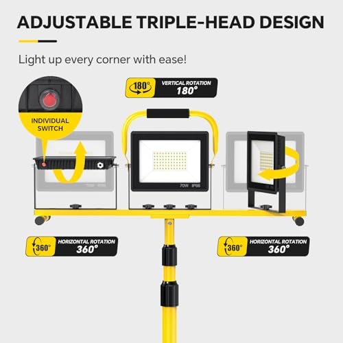 LED Work Lights with Stand: 3 Head Adjustable Work Light with Individual Switch, IP66 Waterproof Foldable Outdoor Tripod Light for Job Site Construction Lighting, Tool Gifts for Men