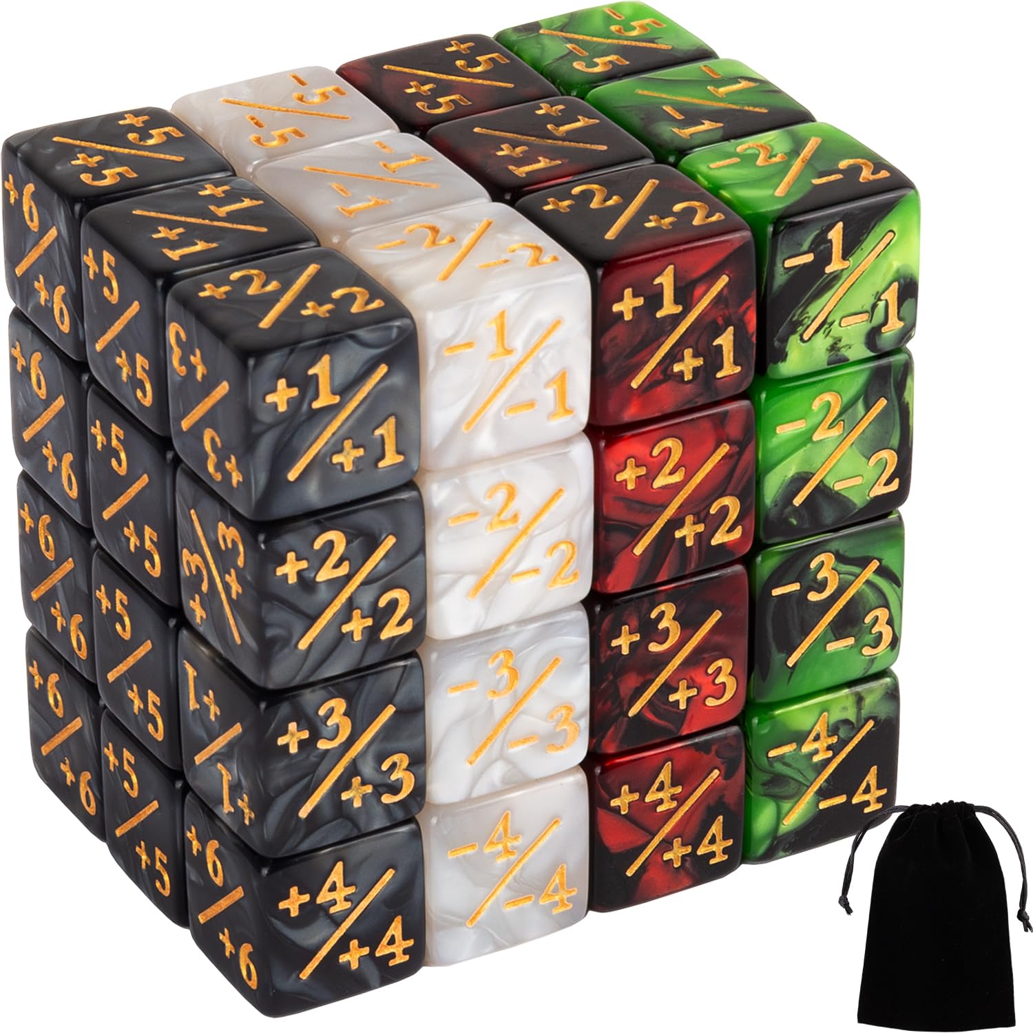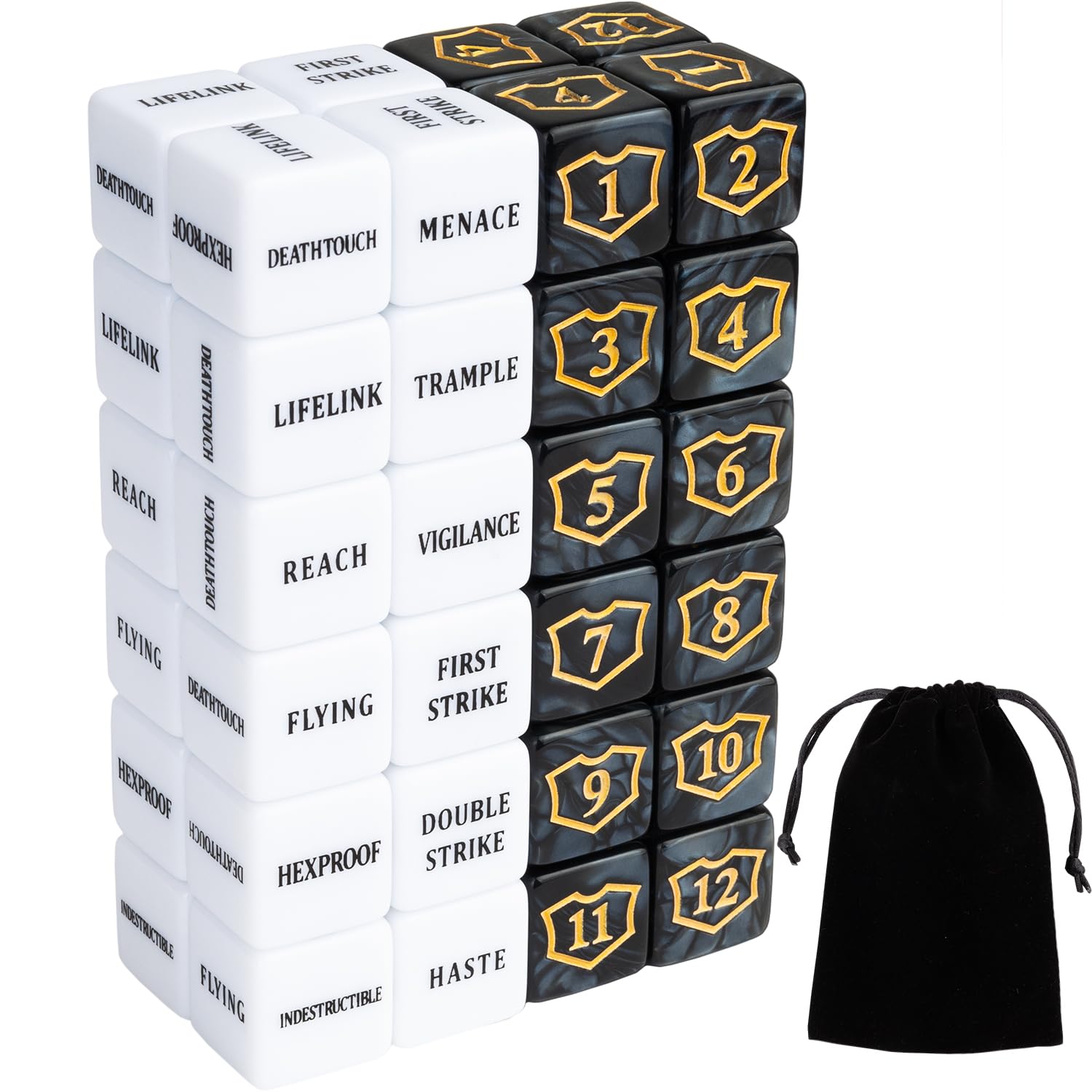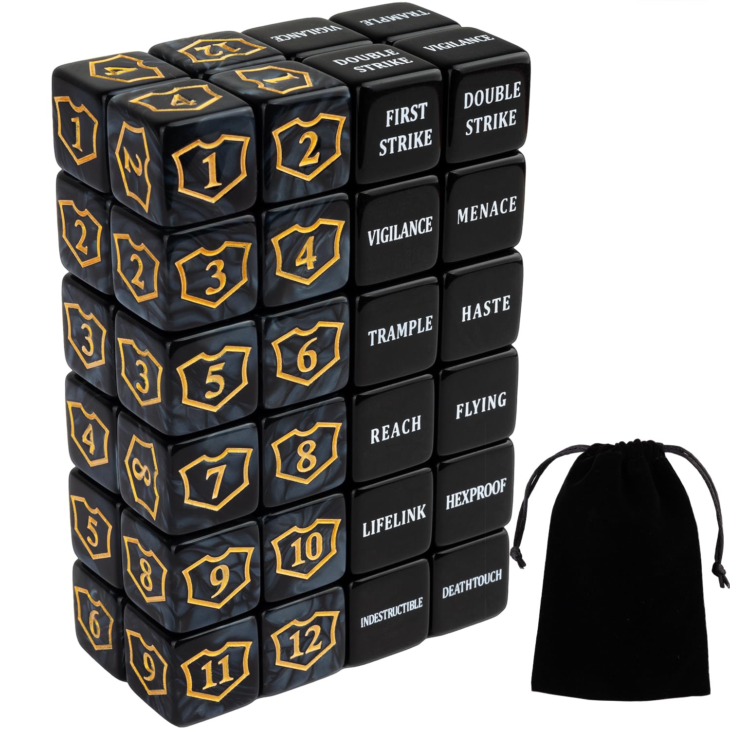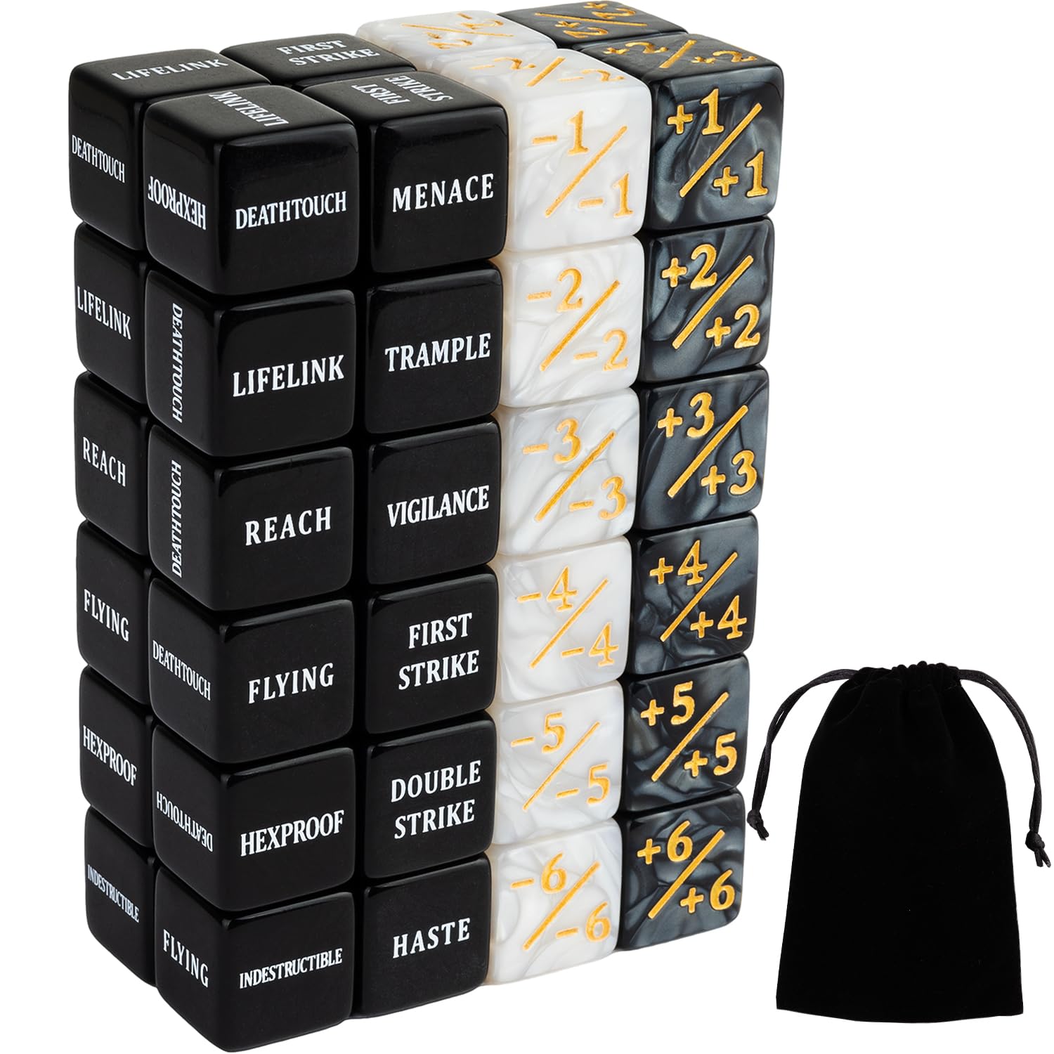- Package Include: Total 24pcs black MTG keywords dice(FIRST STRIKE,DOUBLE STRIKE VIGILANCE,MENACE,TRAMPLE,HASTE / LIFELINK,REACH,FLYING,HEXPROOF,DEATHTOUCH,INDESTRUCTIBLE) and 24pcs dice counters(12 pieces blue -1~-6 counters & 12 pieces purple +1~+6 counters) with velvet pouch.