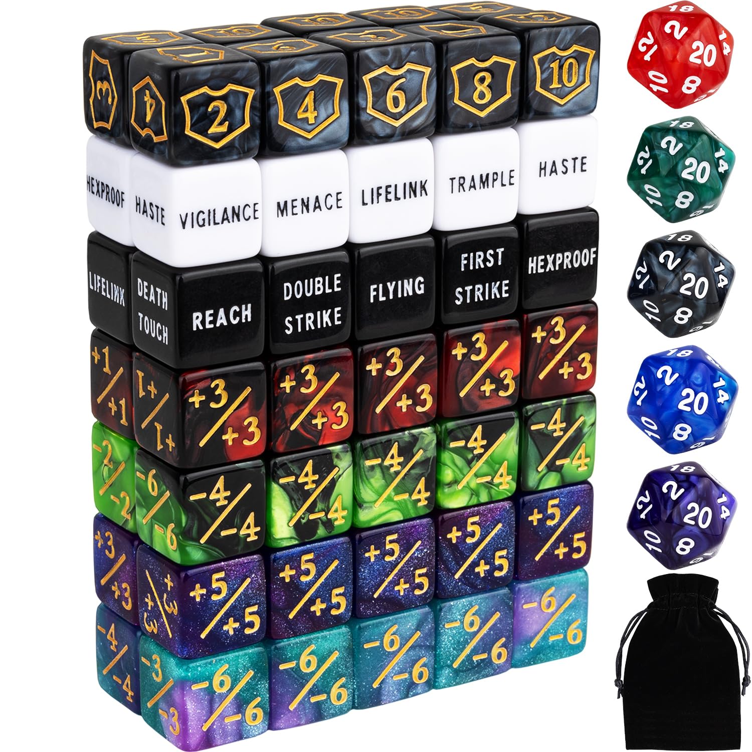 48 Pieces Keywords MTG Dice Counters Plus 1 Life Counter Dice Abilities Creature Stats Buff Tokens Dice Set for Magic The Gathering, MTG, TCG, Card Games Accessories
