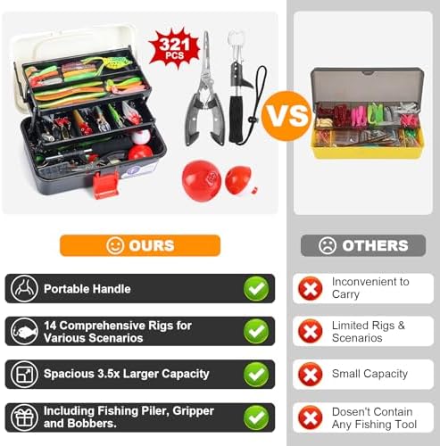 - 【Comprehensive Fishing Kit】 - It's a complete package with essential tools like pliers and a fish gripper, plus a full set of fishing accessories. It simplifies preparation, making fishing more hassle-free for impromptu trips. The tackle box with tackle included 1 plier and gripper, 2 crankbaits, 1 popper, 1 minnow, 1 pencil, 1 frog, 36 soft lures, and a box of 100 fishing hooks. It also features 40 offset worm hooks, 13 jig heads, 79 weights, and more to cater to diverse fishing needs.