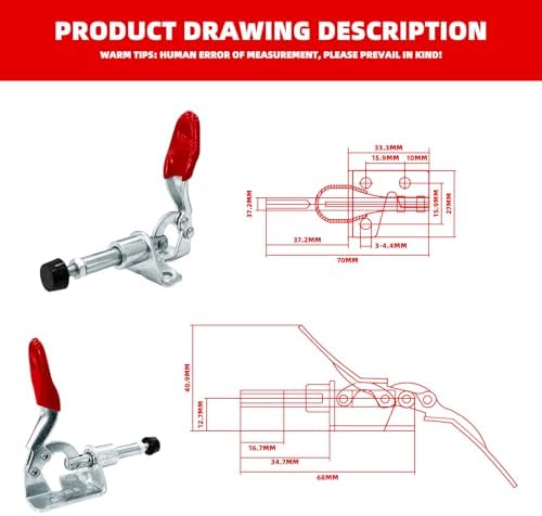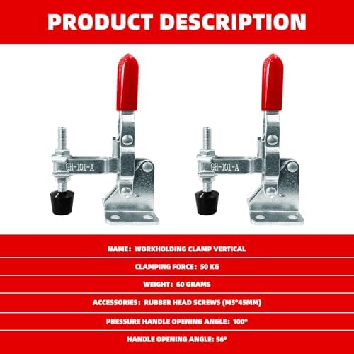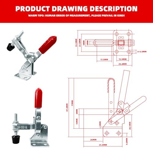 Specifications: Type: Vertical toggle clamp, push pull toggle clamp Material: Cold rolled carbon steel Handle: Red Vinyl grip Holding Capacity: 200 lbs, 110 lbs Toggle clamp size: as shown in the picture Features: -Easy to install and quick to load and unload. -Vertical toggle clamp with 65 degree handle opening angle and 90 degree lever opening angle. -Red handles with plastic caps for easy and comfortable operation. Ideal hand tool for quick fixing of sheet metal or wooden boards. Package Contents: 4pcs hold down toggle clamps 4pcs push pull toggle clamps Note: 1. Due to manual measurement, the size and weight may have a certain error. 2. Due to the difference between different monitors, there may be a slight color difference existed.