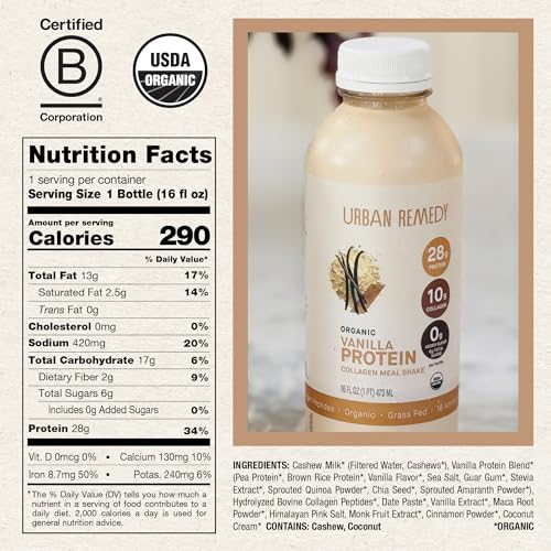 Satisfy your body and your taste buds with Urban Remedy's Organic Vanilla Protein Collagen Meal Shake – a nutrient-dense, creamy shake that delivers 28g of plant-based protein with 10g of hydrolyzed grass-fed collagen peptides in every bottle. Designed for on-the-go lifestyles, this shake helps support muscle recovery, skin elasticity, joint health, and more. As decadent as vanilla ice cream with 0g added sugar. Crafted with clean, organic ingredients like cashew milk, vanilla, cinnamon, maca root, sprouted quinoa, and chia seeds, this meal shake is dairy-free, gluten-free, and non-GMO – perfect for clean eaters and wellness seekers alike. Whether you're post-workout, powering through a busy day, or simply craving something satisfying and healthy, this is your ideal meal-in-a-bottle.