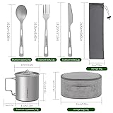 - What will you get?: Zing tti 8-Piece Titanium Utensils Set with Carry Bag: Includes 1x titanium bowl,1x titanium cup, 1x titanium plate, 1x titanium spoon, 1x titanium fork, 1x titanium knife, 1xcloth and utensils carry bag. Portable and lightweight, so you can take it anywhere outdoors. Healthy material: The kitchenware is made of 99.9% titanium, a world-recognized biophilic metal, which is rust, non-toxic, durable, and long-lasting. Ultra-lightweight material: Titanium is very lightweight, and pure titanium tableware is usually only 50% of the weight of stainless steel table of the same size, making it easy to carry and perfect for family camping, RVs, and home use. Storage Set: The storage bag keeps all items together. We also include a utensil bag with a drawstring so your utensils won't get or clank around. Easy and convenient to carry. Use for long trips, camping, picnics, beach parties, etc. 【Multifunctional】This set is perfect for any beverage or food you might want to put in it. You can drink coffee, water beer out of the cup, and with the plate and bowl, you can put almost any kind of food in it, pasta, meat, meatballs, sou or stews.