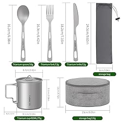 What will you get?: Zing tti 8-Piece Titanium Utensils Set with Carry Bag: Includes 1x titanium bowl,1x titanium cup, 1x titanium plate, 1x titanium spoon, 1x titanium fork, 1x titanium knife, 1xcloth and utensils carry bag. Portable and lightweight, so you can take it anywhere outdoors. Healthy material: The kitchenware is made of 99.9% titanium, a world-recognized biophilic metal, which is rust, non-toxic, durable, and long-lasting. Ultra-lightweight material: Titanium is very lightweight, and pure titanium tableware is usually only 50% of the weight of stainless steel table of the same size, making it easy to carry and perfect for family camping, RVs, and home use. Storage Set: The storage bag keeps all items together. We also include a utensil bag with a drawstring so your utensils won't get or clank around. Easy and convenient to carry. Use for long trips, camping, picnics, beach parties, etc. 【Multifunctional】This set is perfect for any beverage or food you might want to put in it. You can drink coffee, water beer out of the cup, and with the plate and bowl, you can put almost any kind of food in it, pasta, meat, meatballs, sou or stews.